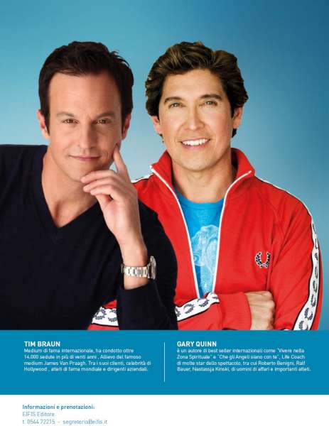 Gary Quinn. Autore internazionale di best seller, Gary Quinn condivide le sue conoscenze con un pubblico mondiale attraverso il suo auto-aiuto, libri motivazionali, cd-audio, comparse in televisione e radio, e numerosi discorsi, seminari e impegni mondiali. Parecchi dei suoi recenti libri sono diventati best seller in questo campo e sono riconosciuti come strumenti essenziali per coloro che cercano di migliorare le loro vite rafforzando mente, corpo e spirito. Gary è spesso e forse meglio descritto come stimolante "Intuitive Life Coach". I suoi sforzi sono stati chiamati "cambiamento di vita". Il suo obiettivo è quello di aiutare le persone a prendere controllo delle loro vite e rendere le loro esperienze di vita più soddisfacenti. Gary è il fondatore del Programma Touchstone For Life Coaching Certification a Los Angeles e di The Angelic Intervention Coaching, che allena, trasforma e rafforza individui per creare vite soddisfacenti. I suoi insegnamento sono stati abbracciati da persone provenienti da tutti i sentieri di vita incluso gli intrattenitori, gli atleti e i leader aziendali. Tra i suoi diversi clienti vi sono i vincitori del Premio Academy, i vincitori del premio Grammy e i vincitori delle medaglie d'oro Olimpiche. Tra i suoi clienti aziendali vi sono AMSNBC, Mattel Toyys, Diesel, Indigo corporation. Altamente intuitivo che lavora con le forze angeliche, Gary è richiesto in tutto il mondo per seminari, workkshops, sessioni private e apprarizioni televisive. Il messaggio potente di Gary ha mostrato alle persone in tutto il mondo come portare gli angeli nelle loro vite di tutti i giorni, aprire il potere dell'amore e trovare la felicità. Tiene frequentemente eventi e seminari negli Stati Uniti, Svizzera, Inghilterra, Giappone, Irlanda, Italia, Austria, Germania, Canada e Australia. Nel suo libro popolare "The Yes Frequency" e "Living in the Spiritual Zone", Gary offre ai lettori semplici ma effettivi metodi per accedere alla vera forza all'interno di loro stessi: "Coscientemente o non coscientemente state creando la vostra propria vita tutto il tempo. Portiamo consapevolezza e intenzione a migliaia di scelte istantanee che facciamo ogni giorno nelle nostre vite. Alla fine del giorno, la nostra vita è un composito di tutte queste scelte. Voi avete la forza per creare la vita che desiderate. Questo è un regalo enorme e una tremenda responsabilità. Se non siete soddisfatti della vostra vita, è tempo di visualizzare qualcosa di differente. Usando i miei semplici ma effettivi metodi potete essere aiutati a raggiungere quell'obiettivo. Qualsiasi cosa sognate- un lavoro migliore, una salute più robuta, un nuovo amore, una nuova direzione e mettere fine alle preoccupazione finanziarie- i vostri angeli vi stanno aspettando per guidarvi e aiutarvi a raggiungerli. Gary è stato rappresentato su Vogue, Bella, Avanti, Glamour Italy, Gala, Toronto Sun, Woman's Weekly, Red Magazine, Best, Los Angeles Times, N.Y Times, People Magazine, US Magazine, Country LIving e InStyle Magazine, Extra TV, Canadian Television, BBC, Discovery Channel, CBS-TV, Granada ITV, This MorninngUK, Sat-1, VH-1, Fox TV, Pro Sebenn-German TV-Academy Awards Special ed è stato intervistato da Leeza Gibbons, Rolanda Watts, e Shirley MacLaine, in oltre 200 trasmissioni radiofoniche in tutto il mondo.
